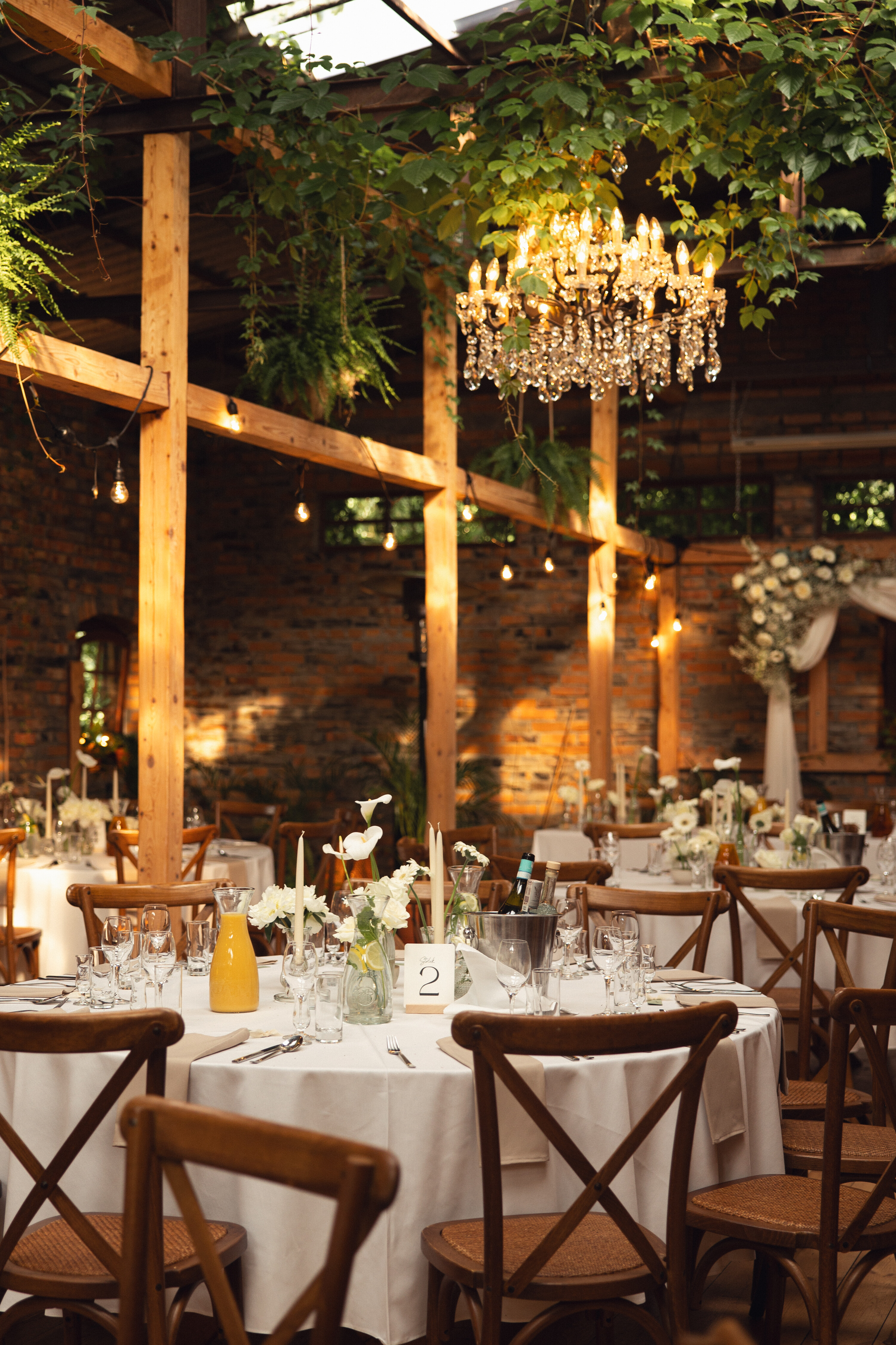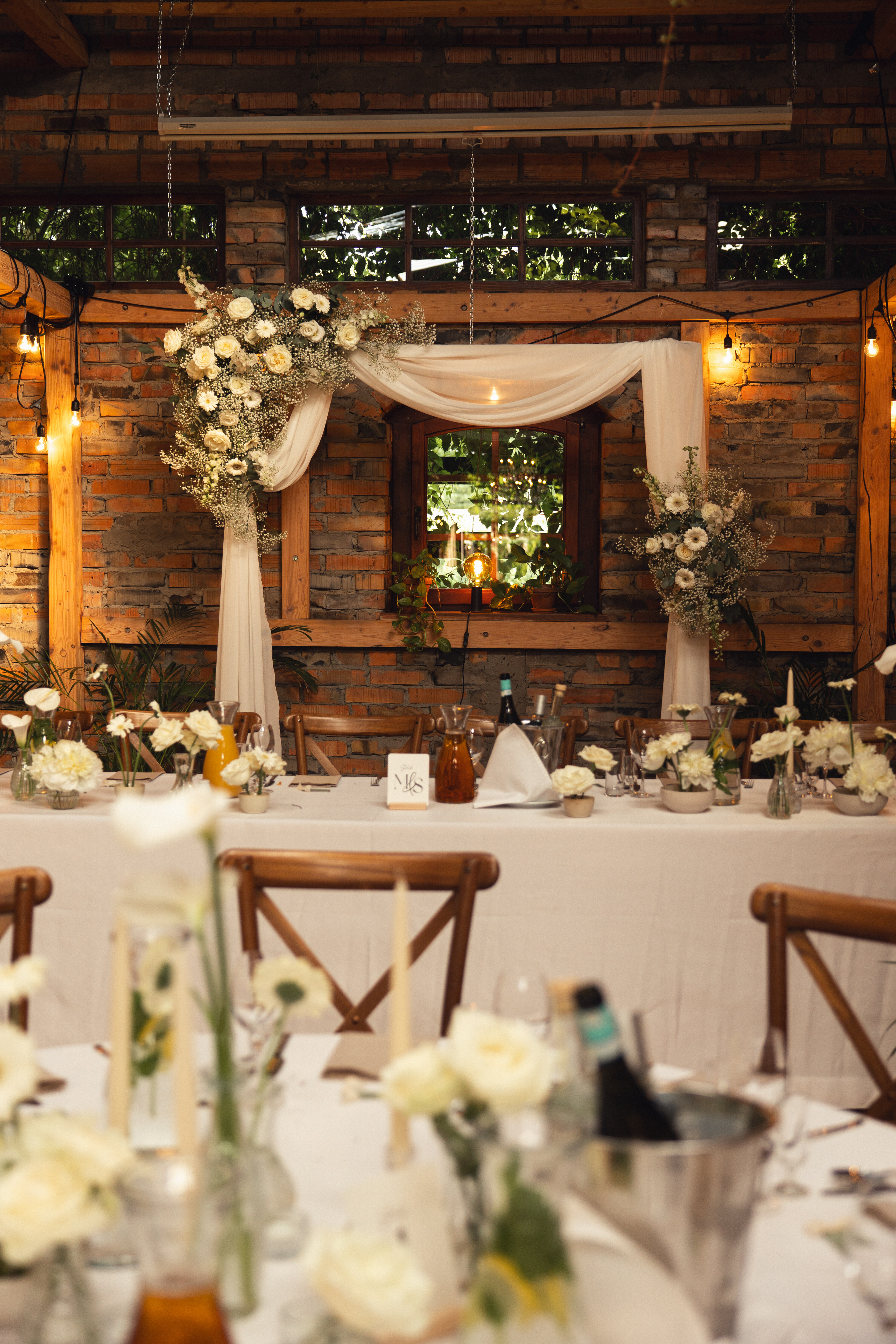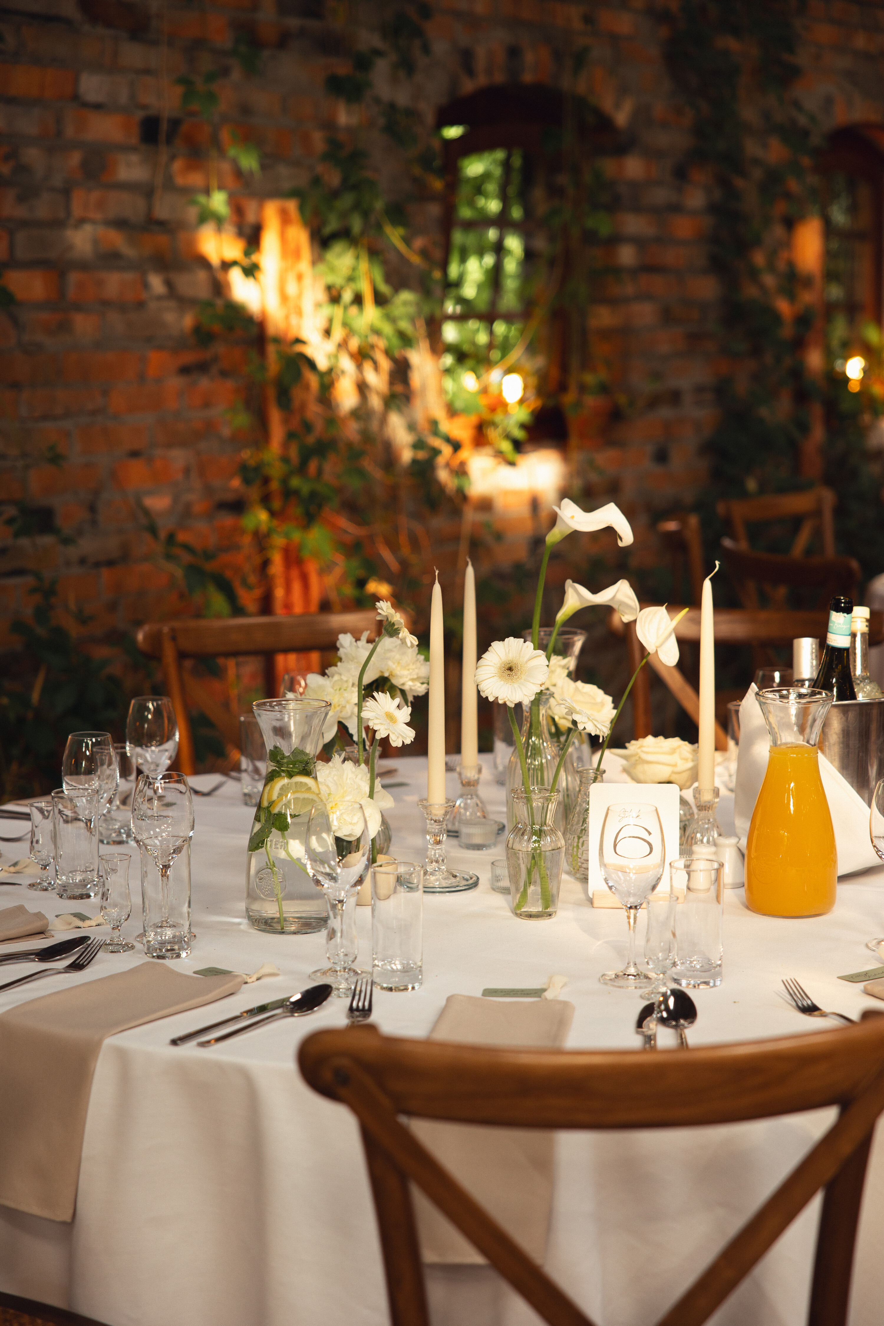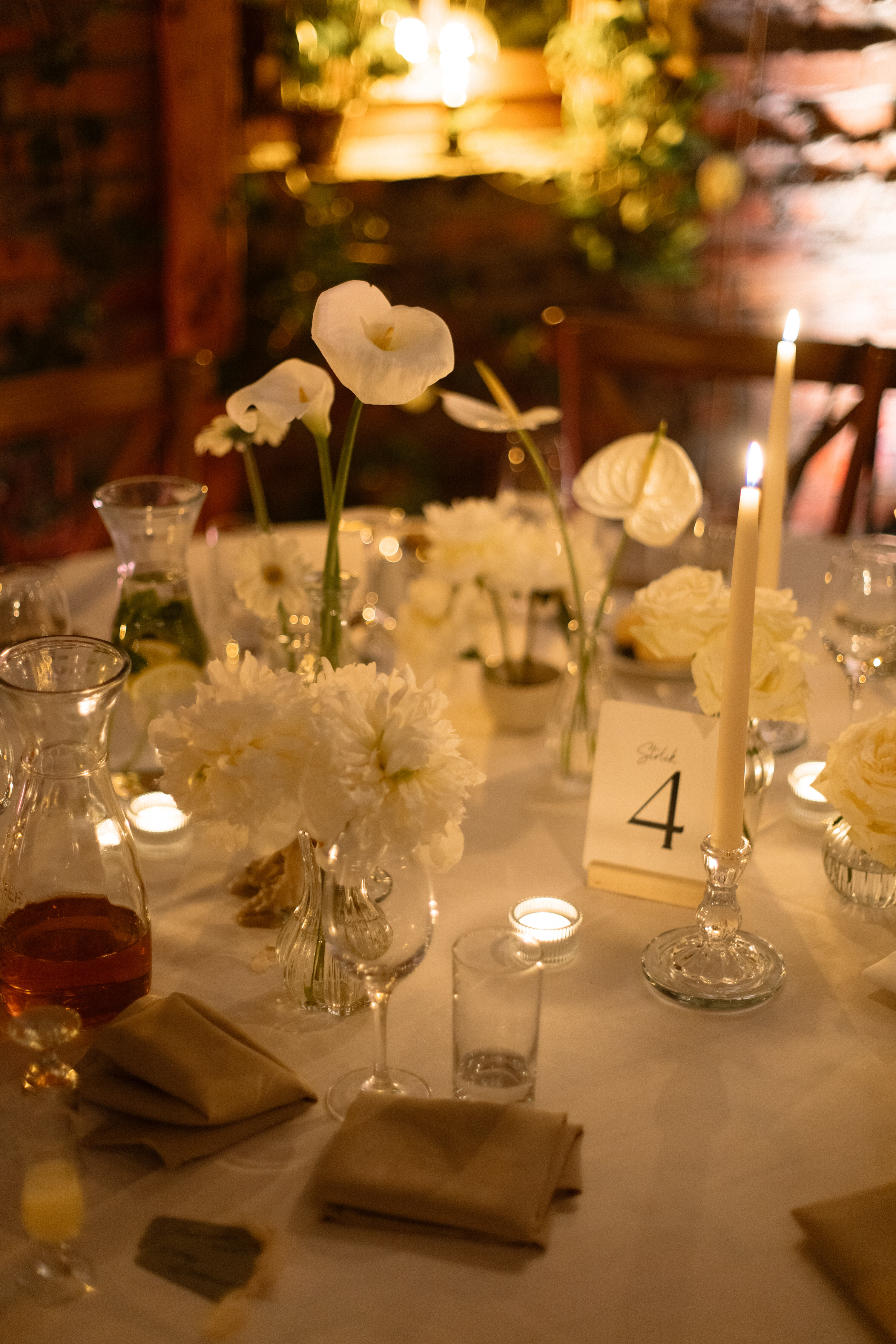 Wesele w Cichej 23 w Markach zostało zaprojektowane w jasnej, eleganckiej kolorystyce opartej na bieli. Na stołach pojawiły się dekoracje kwiatowe w małych wazonikach, które razem tworzyły spójną i lekką aranżację. Taki układ pozwolił uzyskać pełny efekt bez ciężkich form, idealnie wpisując się w charakter sali. Całość to przykład dekoracji ślubnych, w których prostota i elegancja budują atmosferę przyjęcia.